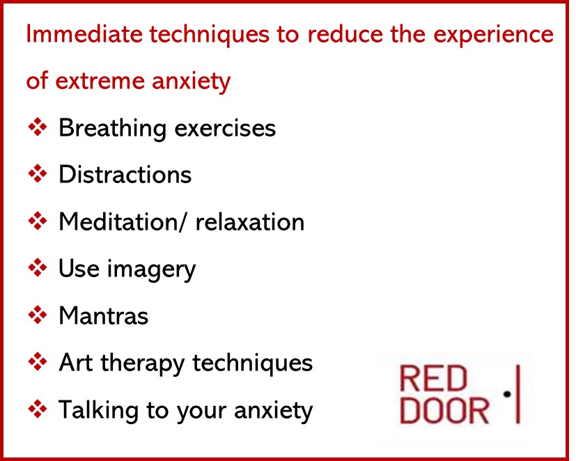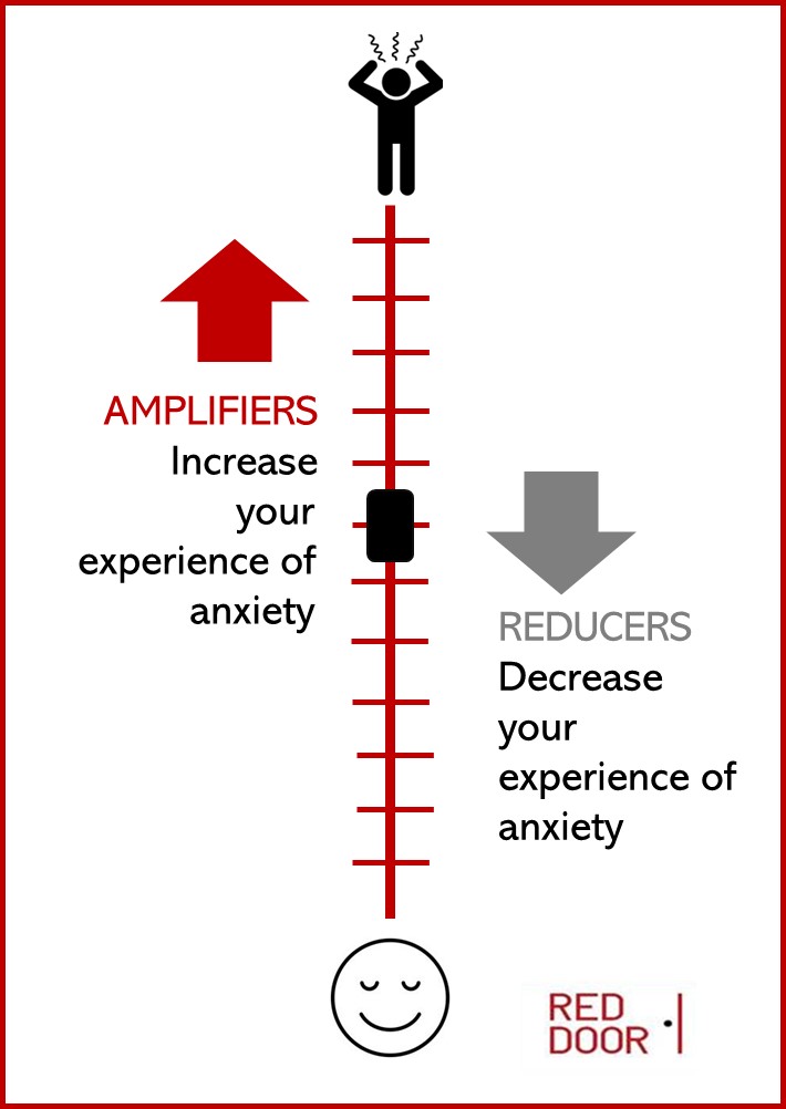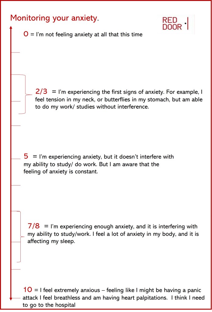 By monitoring your anxiety, and reviewing your anxiety responses from the past, you can explore some of the activities which amplify your experience of anxiety. RED DOOR recently set up anxiety workshops in response to anxiety people report during the current Covid pandemic (Wave 5). Some of the things that amplify people’s experience of anxiety include excessive scrolling of news, consumption of social media and even (careless) conversations with friends and colleagues. Watch how you feel after reading the news, is your anxiety experience rating increasing or decreasing.
