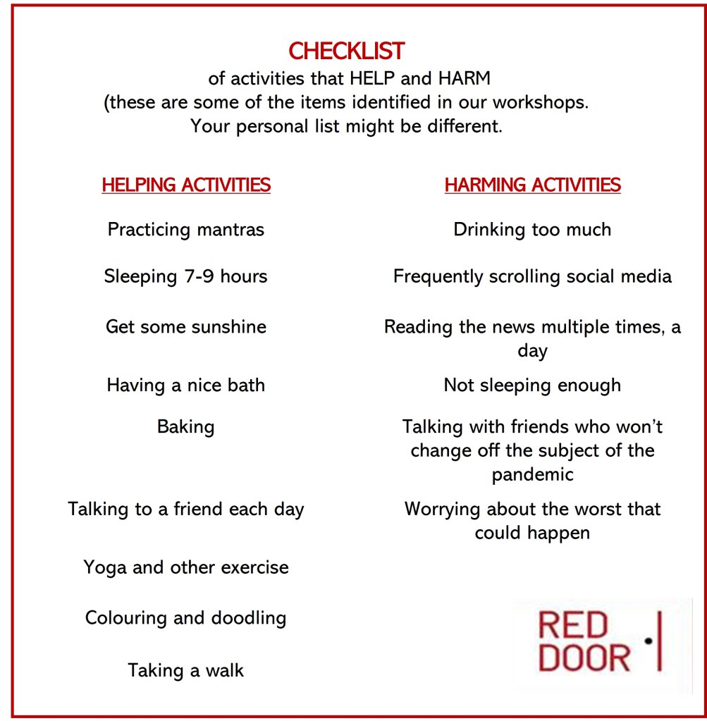 Take the amplifiers that you identified from the exercise above, and the activities that reduce your anxiety. Put them into a checklist under the items of HELP and HARM your anxiety. You want to build a checklist of activities that HELP you and HARM you so that you know what you need to do a daily or weekly basis.
