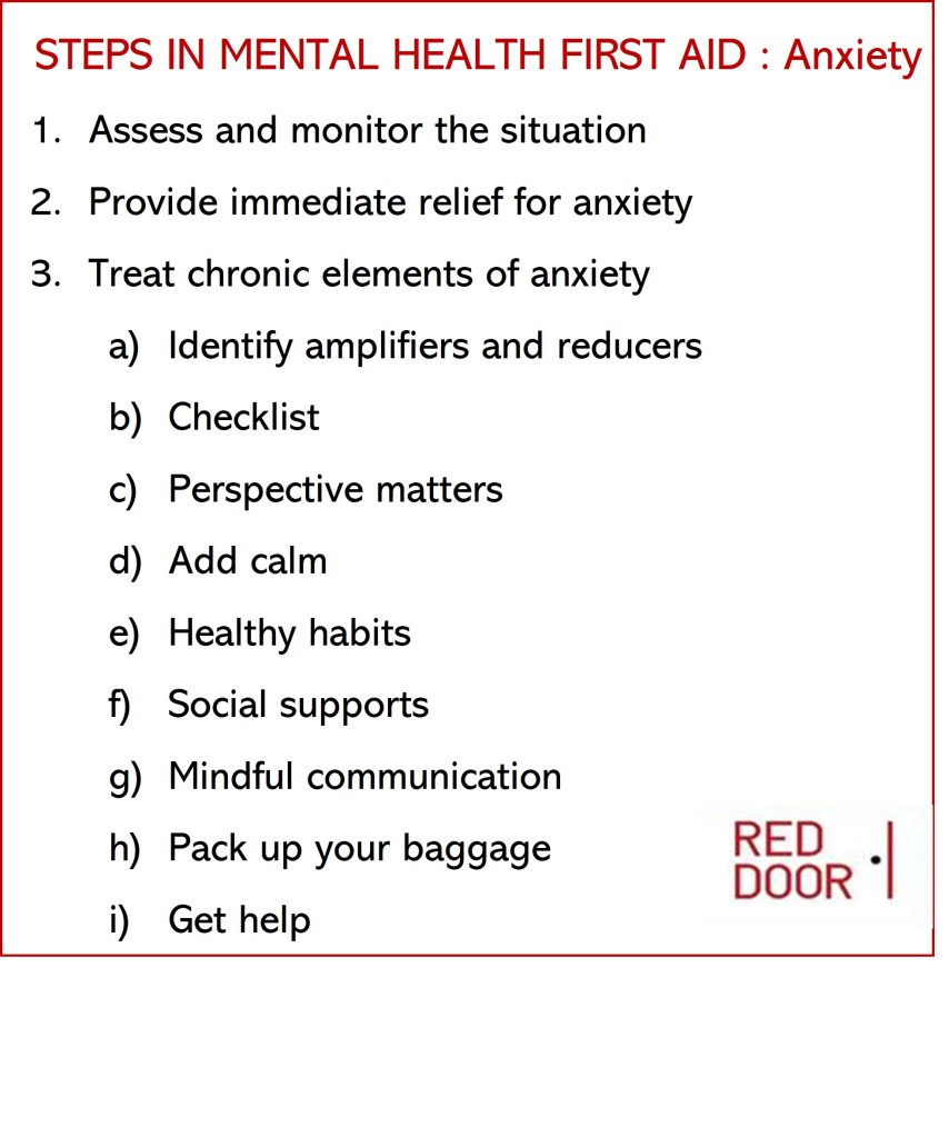 As when we apply first aid to a physical injury we can apply clear steps to provide first aid to the mental health issue of anxiety. Firstly, we need to assess and monitor the experience of anxiety. Secondly, we need to have immediate solutions to treat anxiety in its most threatening form – when we experience anxiety attacks. Lastly, we need to have an organised treatment plan which reduces the chance of anxiety attacks in future (prevention) and builds the ability to better respond should we encounter an attack in the future.
