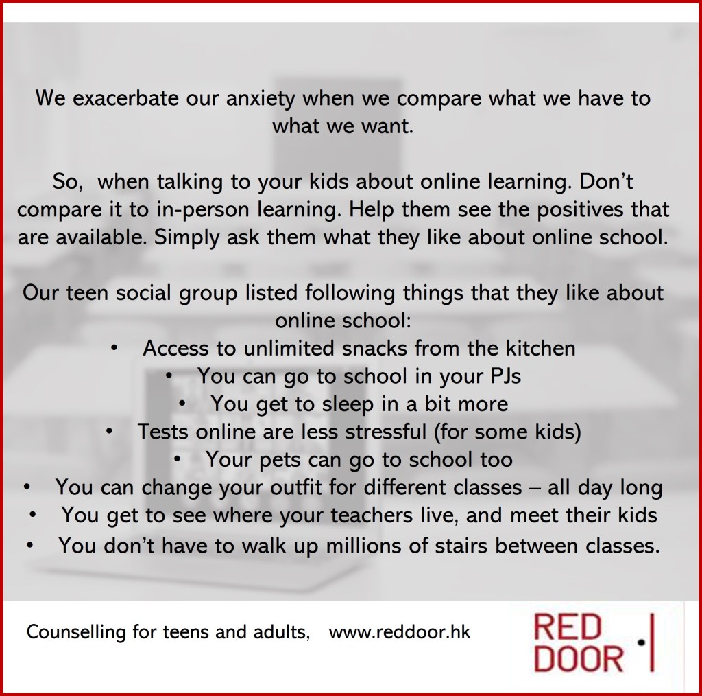 It is common to consider our own attractiveness, status, success, and personal worth relative to others. During a pandemic regularly comparing yourself and your circumstances to those of others can increase your anxiety. Feeling jealous because friends left Hong Kong to live, temporarily, overseas, will not help your need to stay here. It increases your sense of worry – there must be a reason that people needed to flee. Ask yourself if that is really accurate.