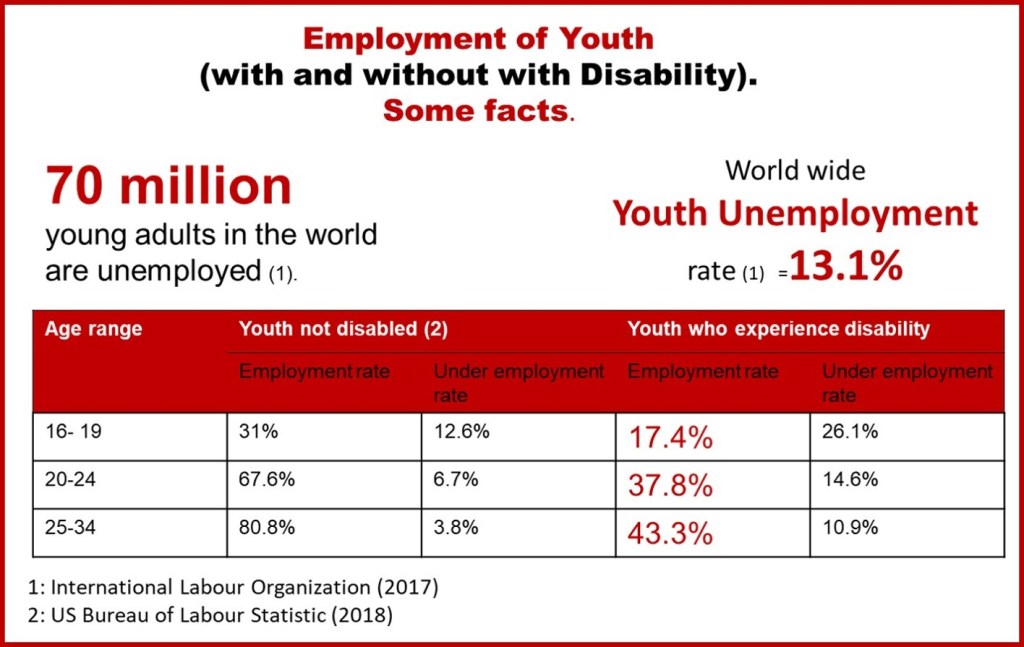 Exploring data from International Labour Organization (2017 data in the link below), global employment trends for growth 2017 suggests the global unemployment rate was 13.1%. The youth population (disabled or otherwise) represents more than 70 million people globally are experiencing unemployment – they are neither in employment or in further education. Young adults are 3 times were 3 times more likely to be unemployed than older adults. And this was BEFORE the global COVID epidemic.