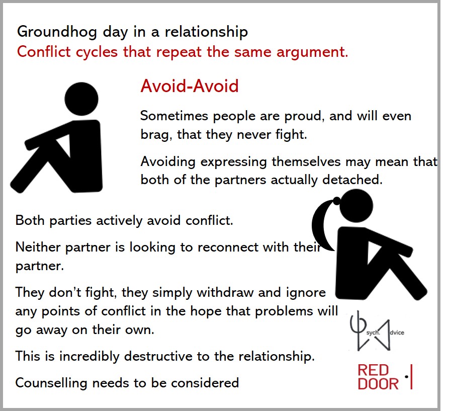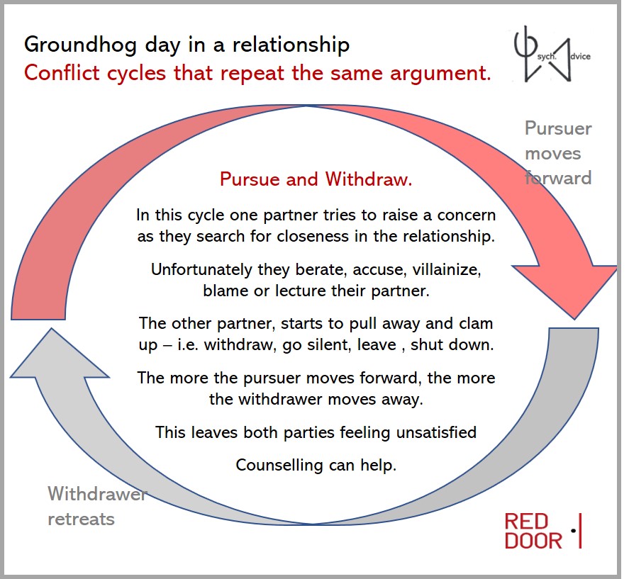 Do you want to break these cycles in your relationship. First of all observe the pattern. Below we have two other articles on how to communicate and build more positive regard, plus an article detailing great books to improve your relationship on your own. At some point in time, you might like to consider couples counselling. I have included some information on our conjoint couples therapy approach that is available at RED DOOR. We have 4 couple counsellors at RED DOOR waiting to help you break the cycle after other recommended readings blow.