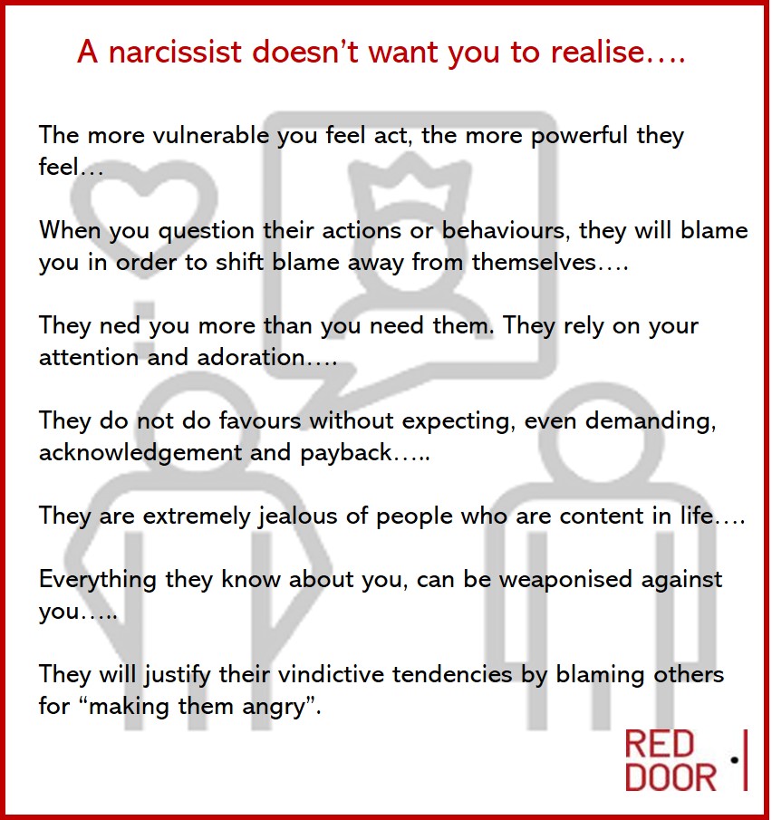 A narcissist will be sensitive to any form of criticism. It is unthinkable that the world around them is failing to understand their greatness. If told that they need to reconsider their behaviour, consider alternative ways of performing a task, they will react quickly, often with anger. They may obsess over plans for vengeance and revenge. This will not usually directly be applicable to their partners, after all they choose you because they believe that you are adoring, however your family, your friends or, even your counsellor, may become candidates for such retribution, if those people dare to raise questions over the narcissist’s behaviours.