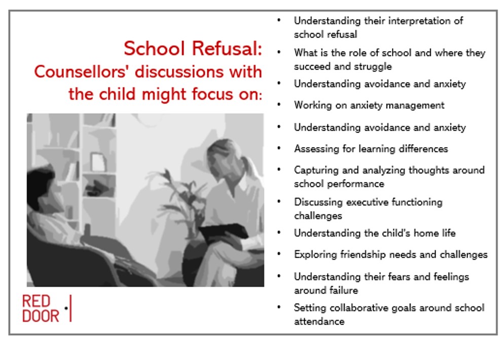 A plan around sessions and discussion by a counsellor with a child or teen who has been refusing to attend school might include the following: