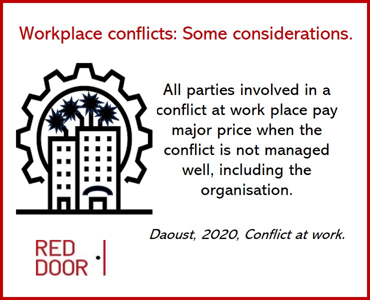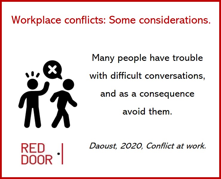 If you are confused by conflict at work, consider discussing your situation with a counsellor. The team at Red Door are all experienced and qualified are all qualified to deal with this topic with their individual clients.
