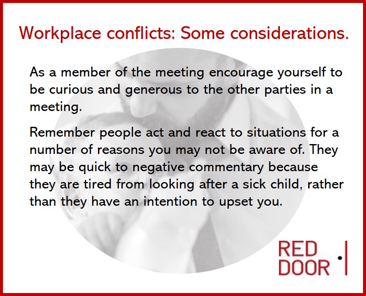 Utilise curiousity – As a member of the meeting encourage yourself to be curious and generous to the other parties in a meeting. Remember people act and react to situations for a number of reasons you may not be aware of. They may be quick to negative commentary because they are tired from looking after a sick child, rather than they have an intention to upset you.