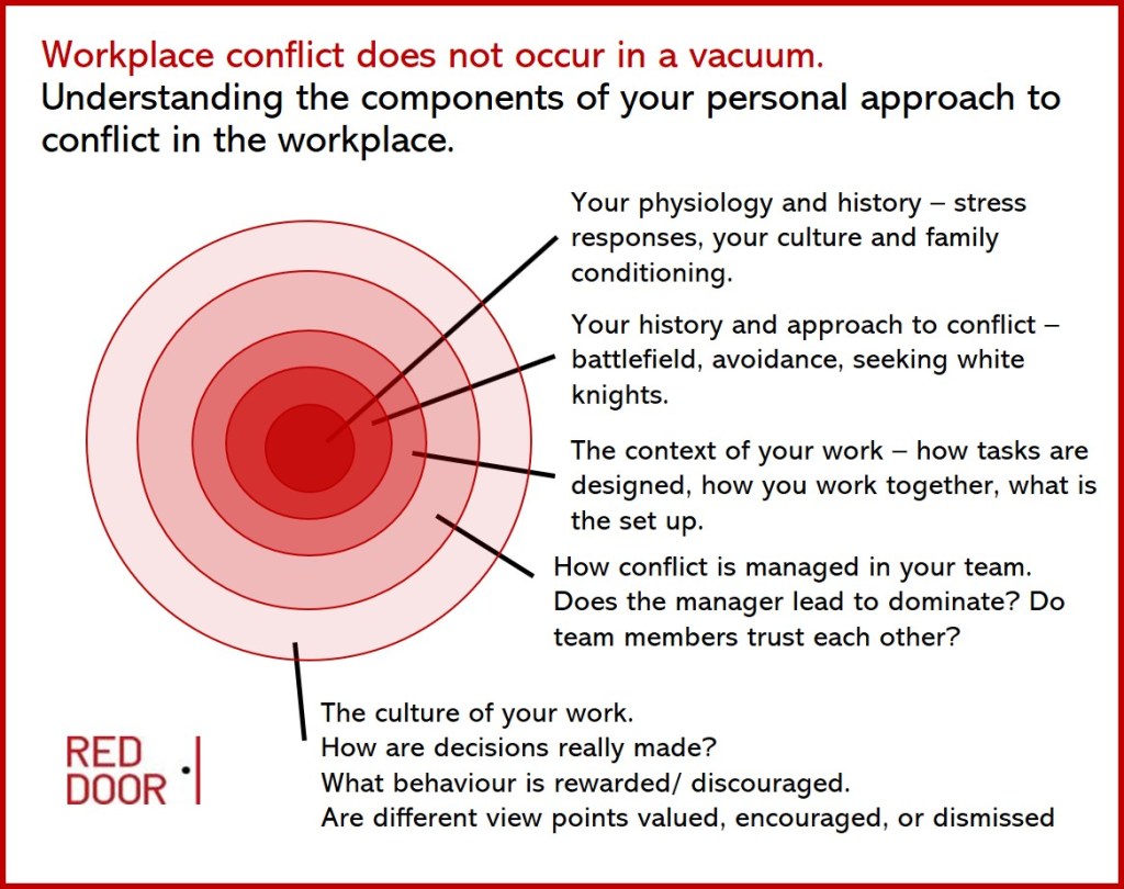 Conflict in the workplace does not occur in a vacuum. Individuals bring their physiology and history of conflict into discussions at work, as well as their personal learnt approach to conflict. The environment, including line management, senior managers, task descriptions, attitudes to collaboration and differing points of view, as well as the culture of an organisation all play a role in conflict creation, and management.