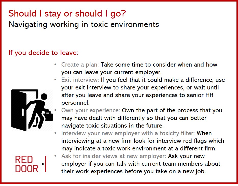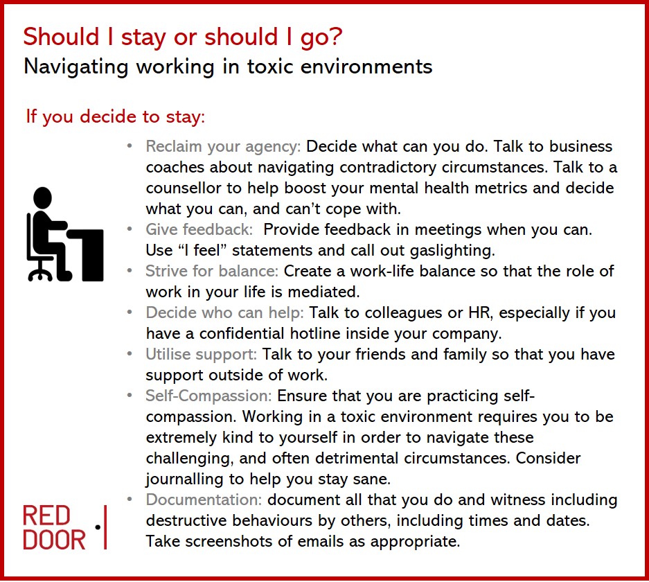 Deciding if an organisation is a good or poor fit for you is completely your decision. When individuals come to counselling to talk about their experience of conflict at work, we will help by asking a series of reflective questions that help those individuals stand aside from the problem, so that the decision may be easier to make. There is significant value in working with an objective person outside of your organisation who is qualified to help you prioritize and protect your mental health. IN addition to aiding your to frame the should I go, or should I stay” question, they can also help you brainstorm the other career ideas, and coping mechanisms.