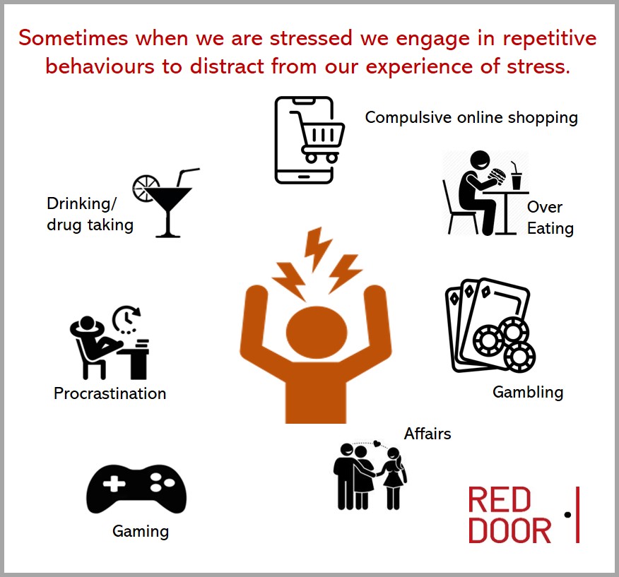 When we are stressed, we may become prone to self-medicating or distracting ourselves from our stress. Occasionally those distractions can actually maintain our experience of stress, or create new stresses for us to have to deal with. For example, alcohol is well recognized as a depressant. Paradoxically people often engage in drinking, to excess, to numb their stress. However over time alcohol robs us of our ability to produce dopamine efficiently, making us depressed.