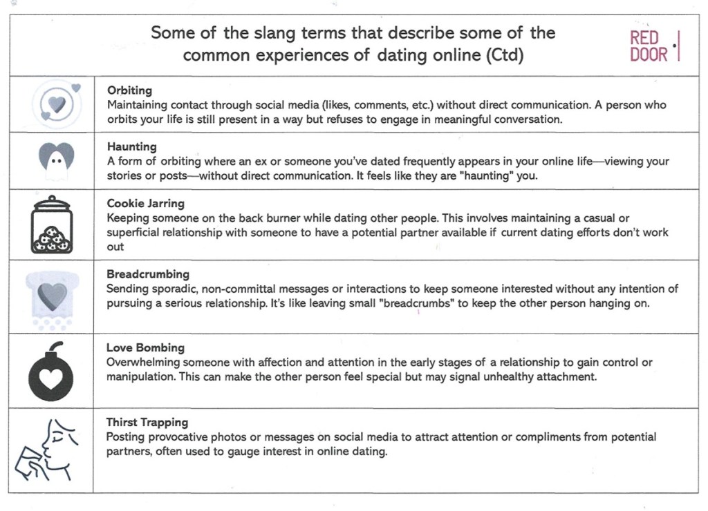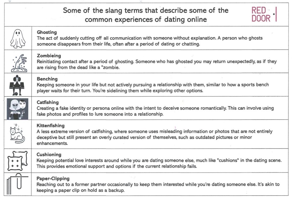 Online dating is definitely different from in-person dating, particularly in terms of the experience. A whole range of slang terms has evolved in response to online dating, which I’ll include as a call-out diagram in this document. Among this plethora of terms are expressions like ghosting, zombieing, and breadcrumbing.